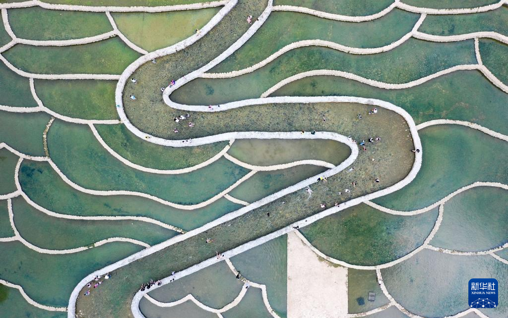 2025年6月7日,市民和游客在五指山市小岛公园鱼鳞坝游玩(无人机照片)。新华社记者 郭程 摄
