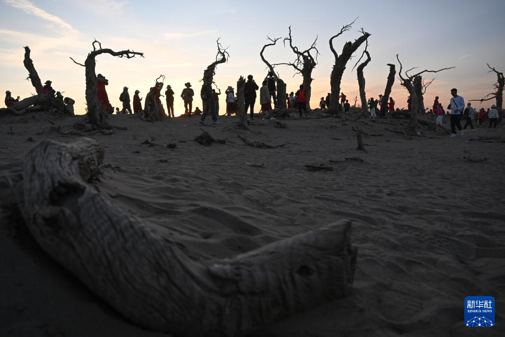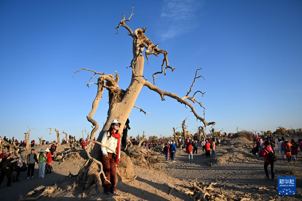 2024年10月14日,游客在内蒙古阿拉善盟额济纳旗怪树林景区游玩。新华社记者 贝赫 摄
