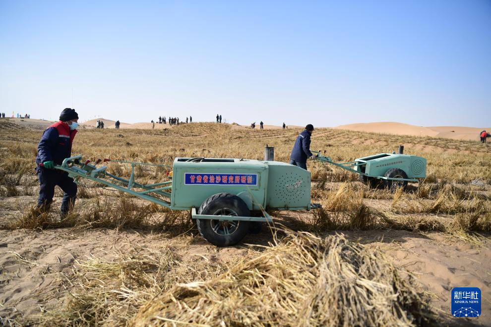 2025年2月28日,在内蒙古阿拉善盟巴丹吉林和腾格里两大沙漠交汇处的阿拉善九棵树项目区,治沙工人使用压草机扎草方格。新华社发(康文魁 摄)
