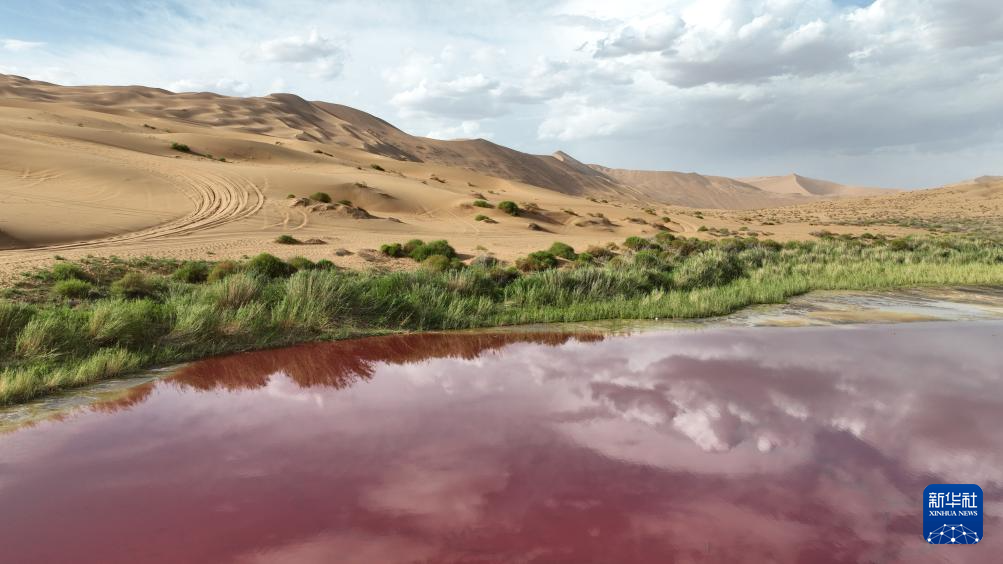 2024年7月30日在内蒙古阿拉善盟阿拉善右旗拍摄的巴丹吉林沙漠中的红海子(无人机照片)。新华社记者 贝赫 摄