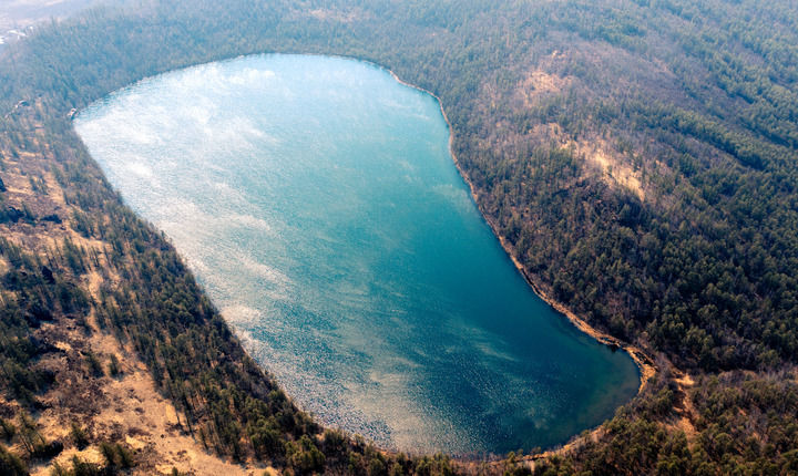 这是5月20日在内蒙古阿尔山国家森林公园拍摄的驼峰岭天池(无人机照片)。新华社记者 马金瑞 摄