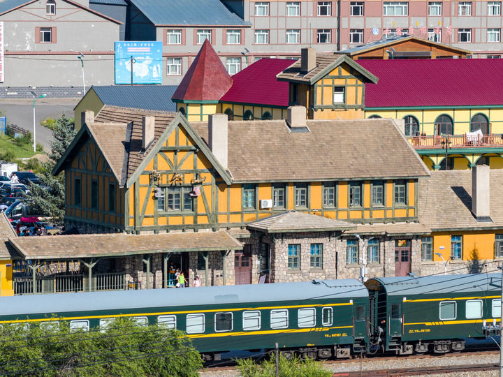 7月27日,一列火车驶出阿尔山火车站(无人机照片)。新华社记者 马金瑞 摄