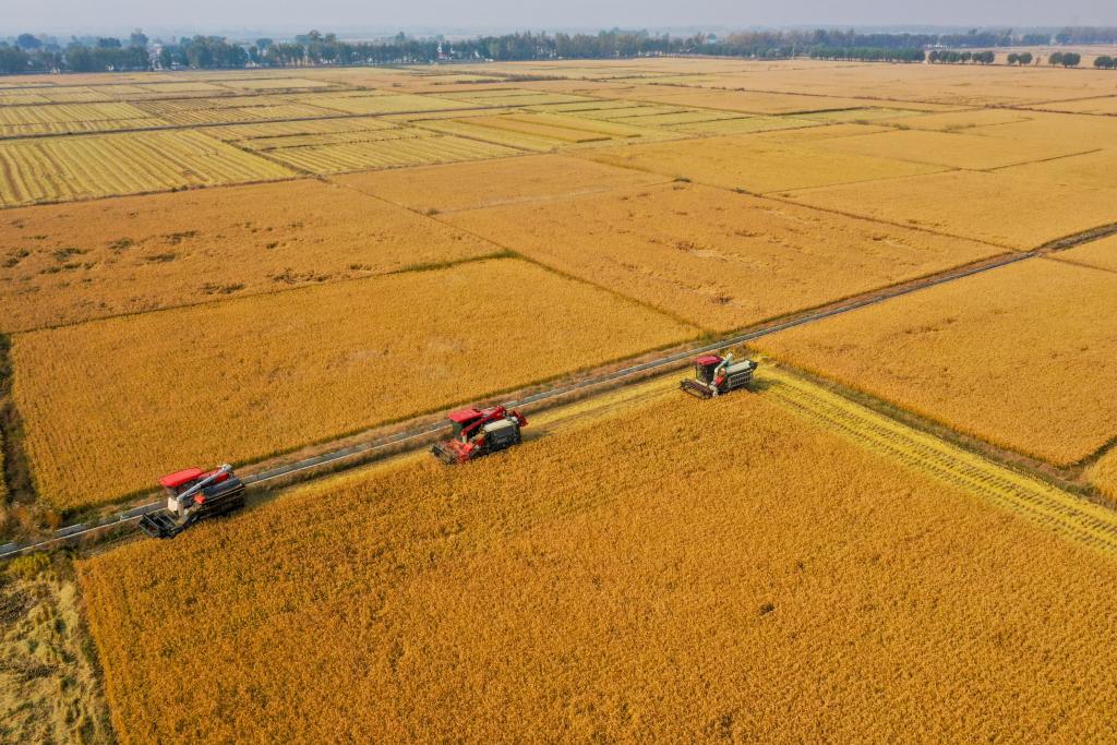 10月14日,在吉林省公主岭市,吉林省米兜种植农民专业合作社进行机械化收割水稻作业展示(无人机照片)。新华社记者 张楠 摄