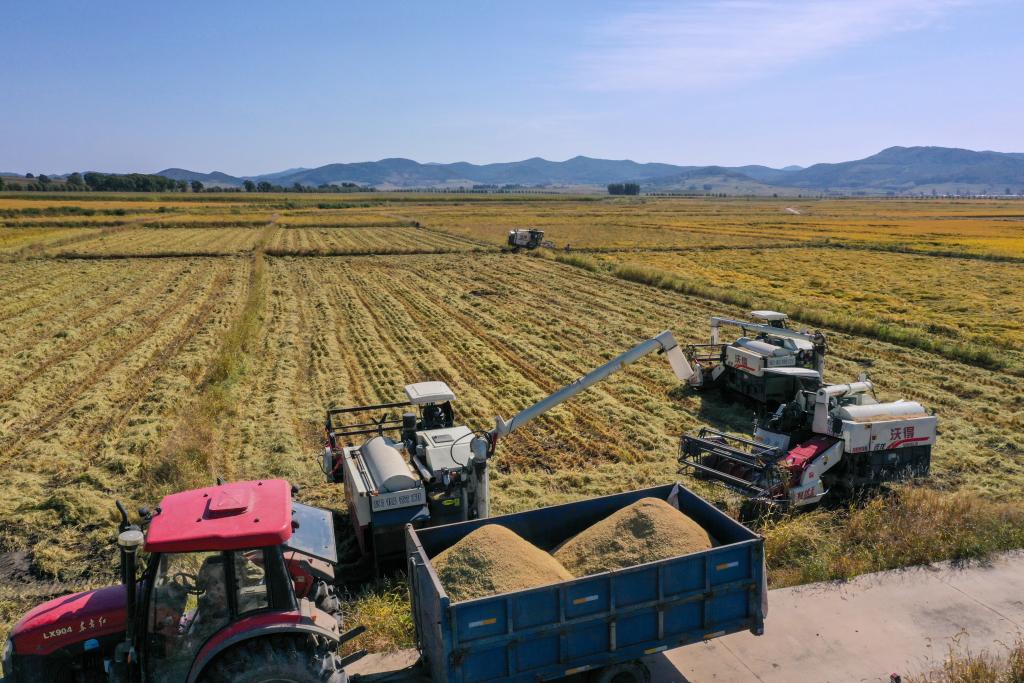 9月23日,在吉林省吉林市永吉县岔路河镇,永吉县鑫丰种植农民专业合作社农民驾驶农机收割水稻(无人机照片)。新华社记者 张楠 摄