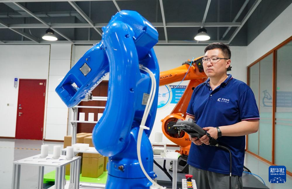在位于龙口市的龙牙智能生产车间里,工作人员在检测一台工业机器人(7月2日摄)。新华社记者 徐速绘 摄