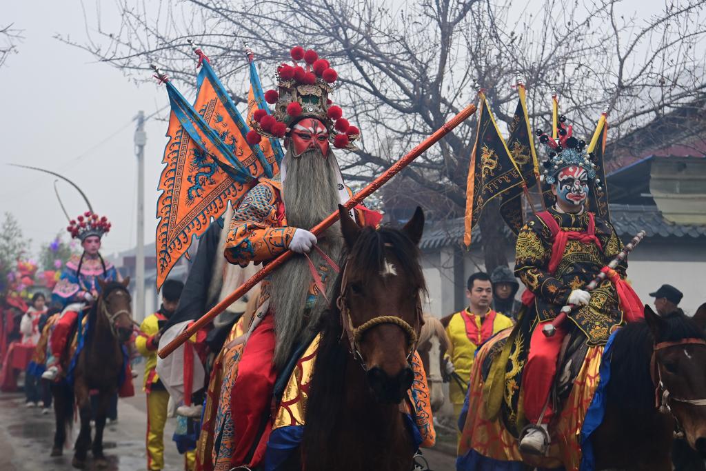 陇县古称陇州,陇州社火已有两千余年历史。马社火是最具代表性的形式之一——表演者骑在马上,装扮成神话或历史人物列队巡游。作为闻名遐迩的“马社火村”,黄花峪村每年春节都会表演马社火,社火队走村串巷祈福纳祥。