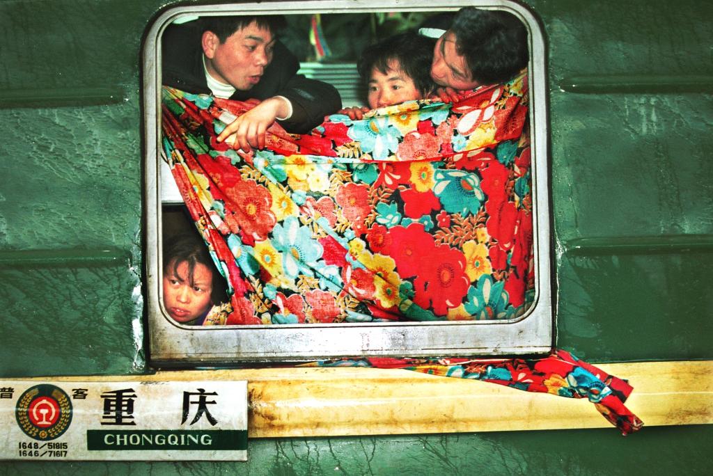 2001年1月21日,从厦门开往重庆的列车路过湖北汉口火车站,旅客透过窗口的挡风被单向外张望。新华社发
