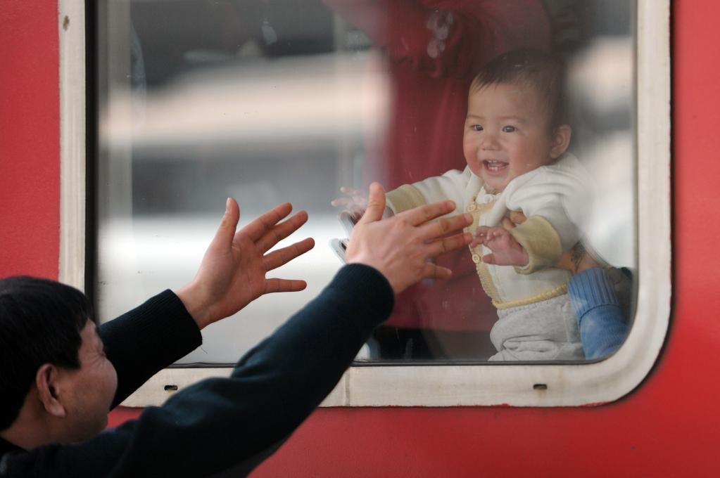 2013年1月26日,从浙江宁波东开往广州的列车到达杭州火车站时,阳先生利用停车间隙在站台上与同行的小孙子“拥抱”。新华社记者 鞠焕宗 摄