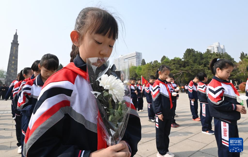 4月2日,河北省邯郸市邯山区赵王小学的学生在晋冀鲁豫烈士陵园为烈士默哀。