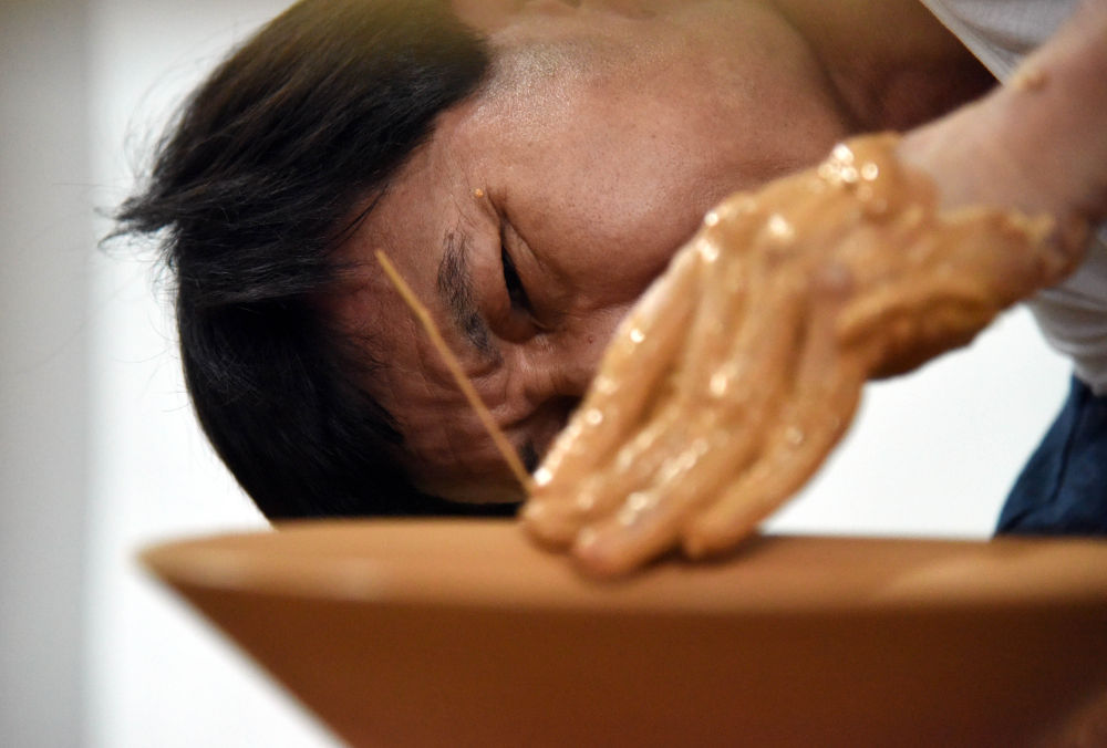 在位于江西省景德镇市善窑厂的车间里,陶瓷匠人正在进行拉坯。新华社记者万象摄