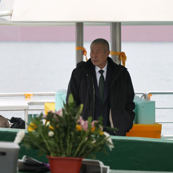 早上,陈琦乘海葬船出海(4月3日摄)。