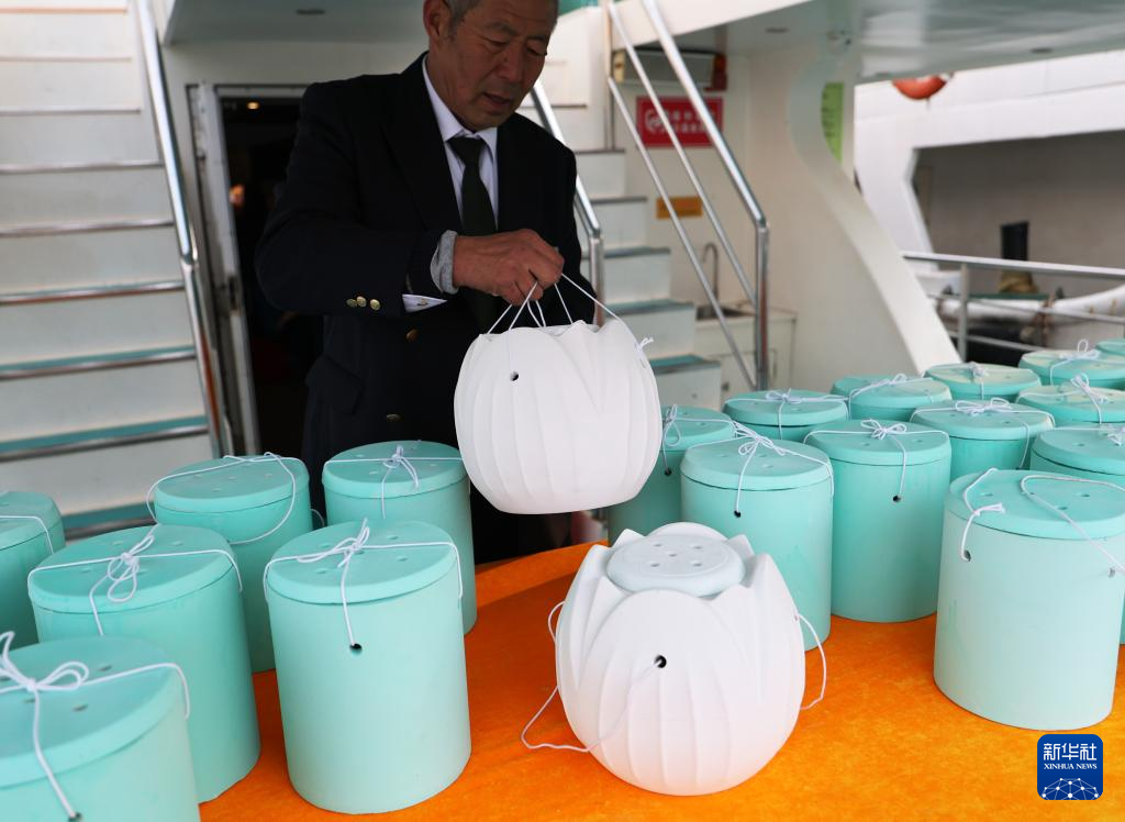 海葬仪式上,陈琦团队的工作人员帮助逝者家属给可降解骨灰罐插花(3月29日摄)。