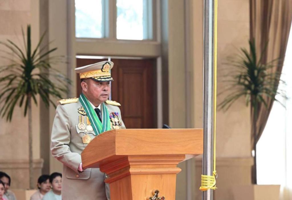 3月30日,耶温乌在缅甸内比都举行的缅甸国防军总司令交接仪式上讲话。新华社发(缅甸宣传部供图)