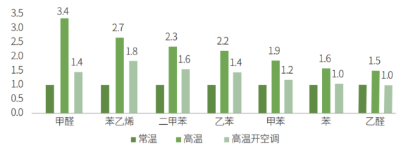 高温模式下的挥发性有机物测评结果不如人意,浓度平均为常温下的2倍。甲醛、乙醛、二甲苯和苯乙烯分别为常温模式的3.8倍、1.5倍、2.3倍和2.7倍。由此可见,消费者“温度越高,车里味道越大”的朴素感知与测试结果相符,高温下的车内污染问题亟待解决。