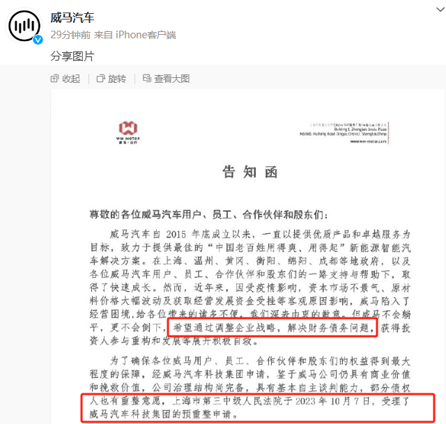 威马汽车在告知函中表示,近年来,因受疫情影响,资本市场不景气、原材料价格大幅波动及获取经营发展资金受挫等客观原因影响,威马陷入了经营困境。“但威马不会躺平,更不会倒下,希望通过调整企业战略,解决财务债务问题,获得投资人参与重构和发展等展开积极自救。”