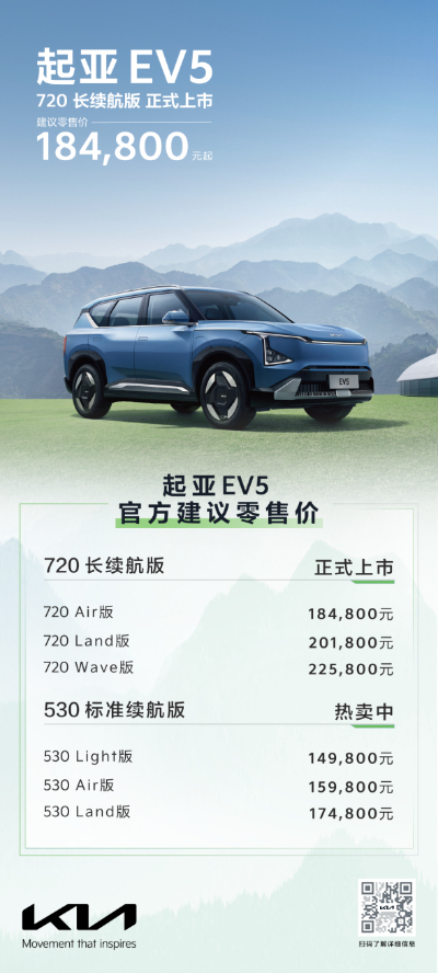 百变生活,不止一面。2月1日,起亚全新纯电动SUV EV5 720长续航版进阶上市,官方建议零售价分别为:720Air版18.48万元、720Land版20.18万元、720Wave版22.58万元。