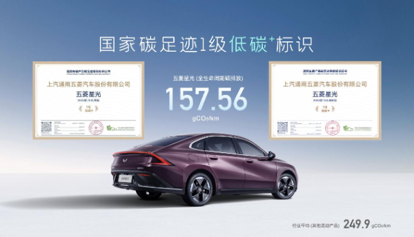五菱星光插混荣获首批国家“碳足迹1级低碳+”标识认证,全生命周期碳排放量仅为157.56gCO₂/km,优于行业混动产品平均的249.9 gCO₂/km。