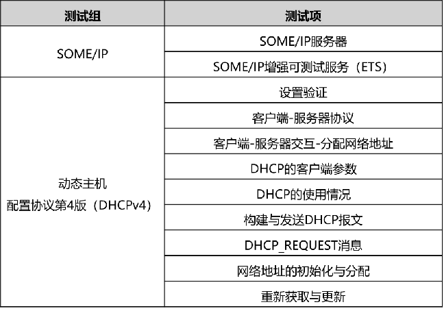 ISO21111-11标准包含车载以太网应用层到会话层的一致性测试规程。通过指定应用层SOME/IP协议与会话层中动态主机配置协议版本4(DHCPv4)的测试系统拓扑结构以及相关CTC配置内容的具体说明,实现从应用层到会话层一致性测试工作的标准化。