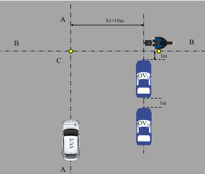 CSTA-LN场景下踏板摩托车以20km/h的速度以与车辆行驶方向相反的方向移动。VUT分别以10km/h、20km/h、30km/h的速度测试。碰撞位置在50%处。该场景主要考察车辆系统在左转弯过程中,对相邻车道对向驶来的踏板摩托车的识别及响应能力。