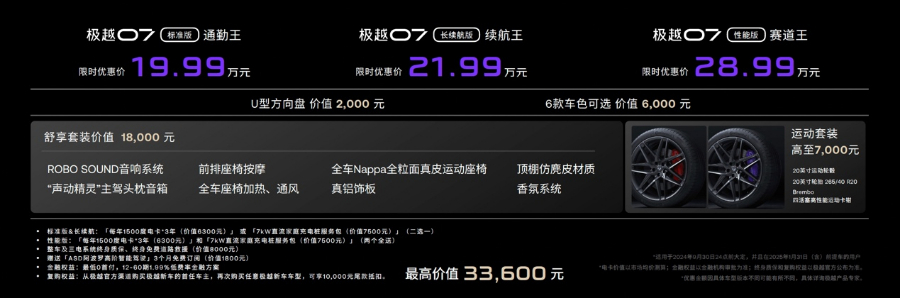 上市当日起至2024年9月30日24点前购车,并在2025年1月31日前提车的用户,还可获得每年1500度电卡3年使用权或7kW直流家庭充电桩服务包、整车及三电系统终身质保、终身免费道路救援、ASD高阶智驾3个月免费体验、复购权益等,最高总价值可达33,600元。