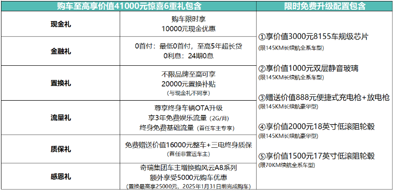风云A8L共推出5款车型,1.5L-DHT 70KM标准型10.99万元、1.5L-DHT 70KM舒适型11.99万元、1.5TGDI-DHT 145KM标准型12.99万元、1.5TGDI-DHT145KM舒适型13.99万元、1.5TGDI-DHT 145KM豪华型14.99万元,并带来购车至高享价值41000元的惊喜6重礼遇,奇瑞置换补贴价低至9.49万元起(不含国补)。