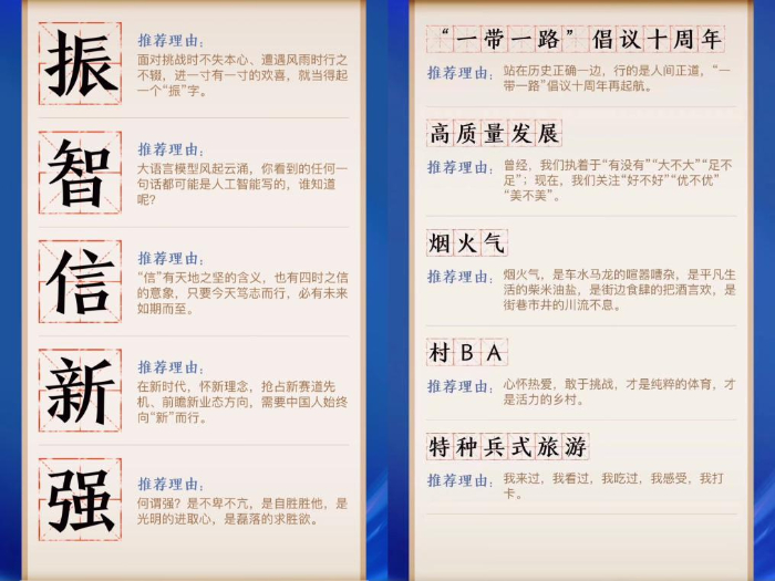 前五位年度国内候选字为“振”“智”“信”“新”“强”,前五位年度国内候选词为“‘一带一路’倡议十周年”“高质量发展”“烟火气”“村BA”“特种兵式旅游”;前五位年度国际候选字为“危”“芯”“战”“谈”“核”,前五位年度国际候选词为“战争”“ChatGPT”“核污染水”“芯片”“巴以冲突”。