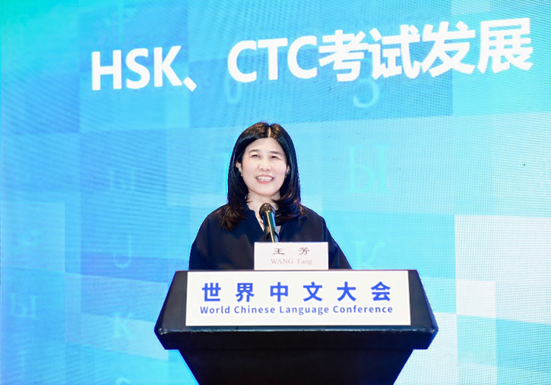 外研集团(外研社)党委书记、董事长,外研社社长王芳在“中文水平考试(HSK)等语言测评应用与国际人才培养”专题论坛上作主题发言。(新华网发)