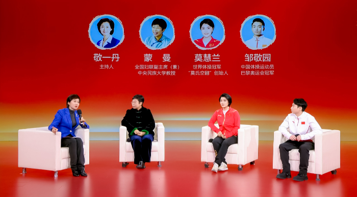 全国妇联副主席(兼)、中央民族大学教授蒙曼,世界体操冠军、“莫氏空翻”创始人莫慧兰,中国体操运动员、巴黎奥运会冠军邹敬园接受访谈。新华网 发