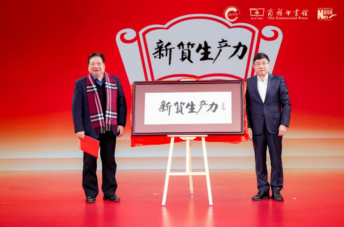 中国辞书学会会长、北京语言大学教授李宇明(左),中国出版集团有限公司副总经理、党组成员陈永刚(右)揭晓年度国内词“新质生产力”。新华网 发