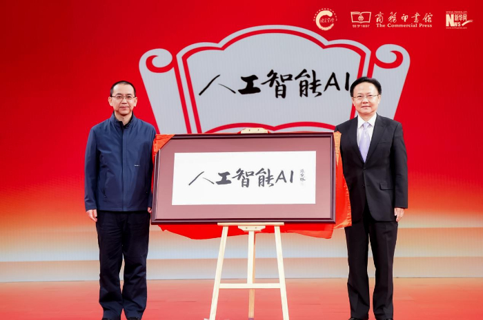 商务印书馆副总经理陈晗雨(左),中宣部“学习强国”学习平台编委、副总经理杜大力(右)揭晓年度国际词“人工智能(AI)”。新华网 发