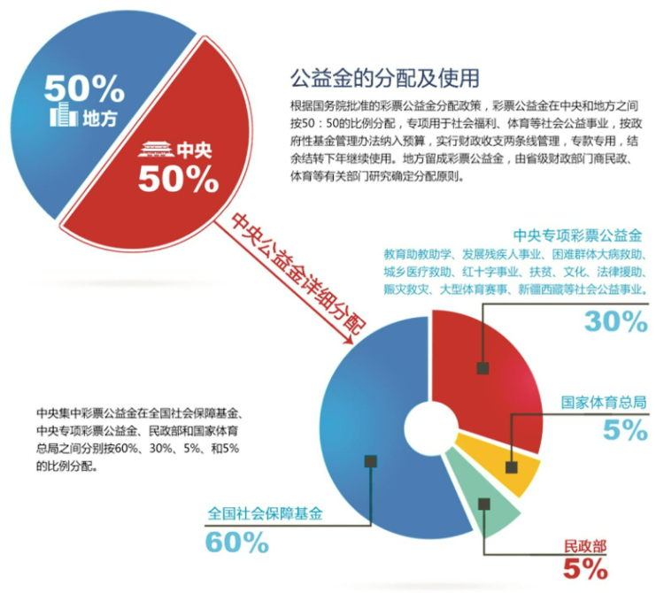 财政部2025年公告显示,2024年全国共筹集彩票公益金1610.31亿元。中央和地方之间按各50%比例分配:地方留成部分由省级财政商民政等部门安排使用;中央集中的50%则在全国社会保障基金、中央专项彩票公益金、民政部和体育总局之间按60%、30%、5%和5%的比例分配。以2024年为例,分配给民政部的中央集中彩票公益金为41.38亿元,专项用于老年人福利、残疾人福利、儿童福利等方面。