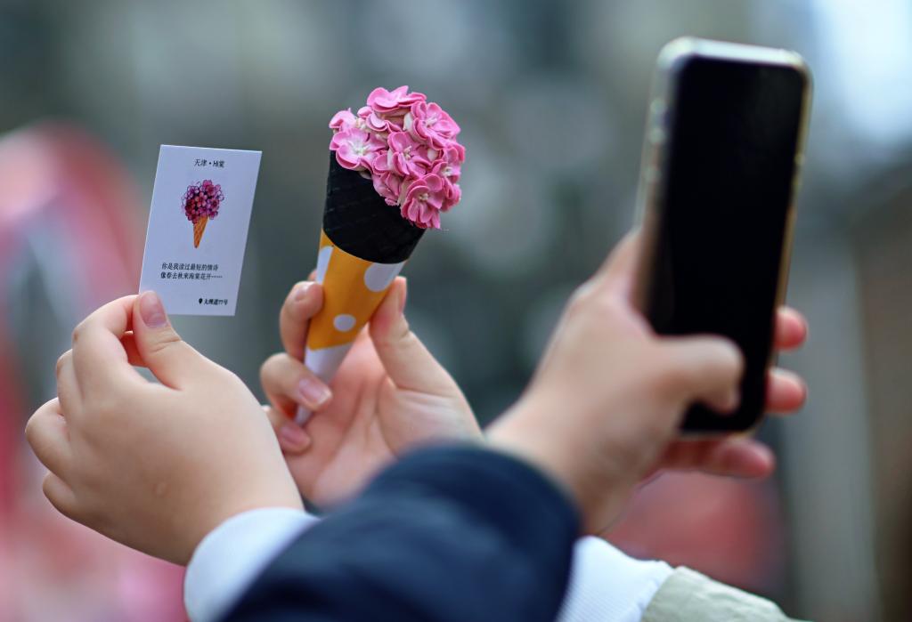 在北京上大学的刘星如趁着清明假期专程赴津赏花,“这里的小洋楼和海棠相互映衬,很美!”兴奋不已的她,正手持一款立体造型的海棠花冰淇淋打卡拍照,“几十元的冰淇淋,价格并不便宜,但确实好看,买的就是氛围感。”