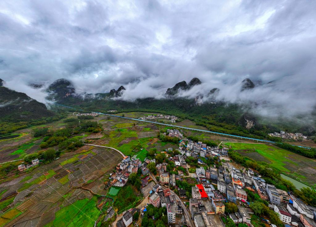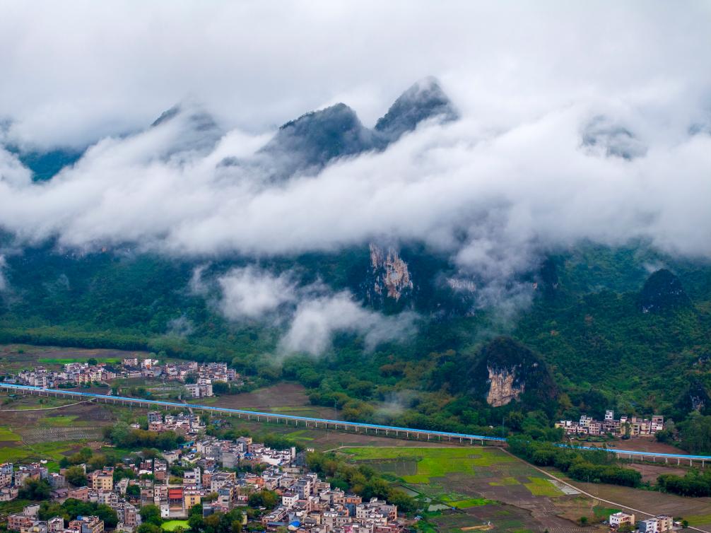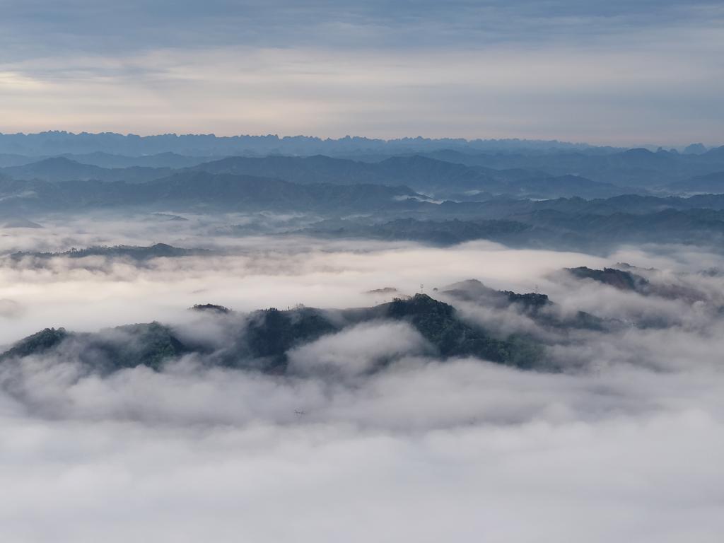 ↑2026年4月1日在广西柳州市融安县境内拍摄的云雾景观。(无人机照片)CICPHOTO/谭克兴 摄