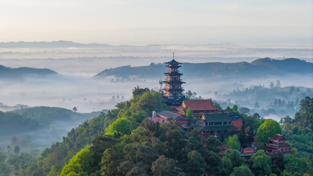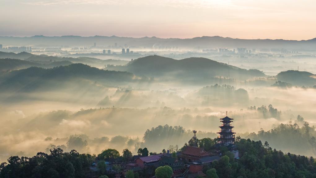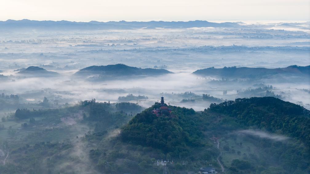 ↑2026年3月31日在四川省眉山市彭山区拍摄的云雾景观。(无人机照片)CICPHOTO/翁光建 摄