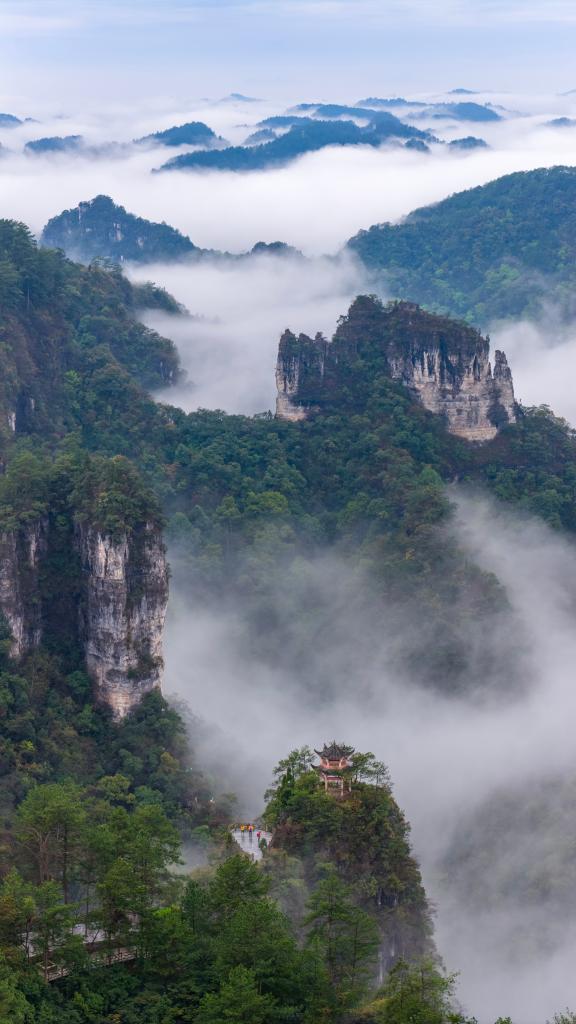 ↑2026年4月1日在贵州省黔东南苗族侗族自治州施秉县云台山景区拍摄的云雾景观。(无人机照片)CICPHOTO/磨桂宾 摄