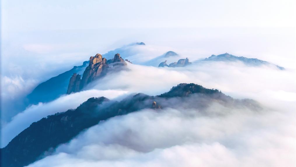 ↑2026年3月7日在安徽省池州市九华山风景区拍摄的云雾景观。(无人机照片)CICPHOTO/李智宏 摄 编辑:刘潋