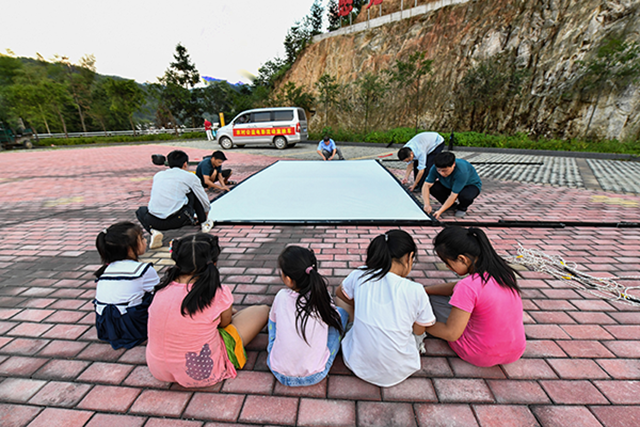 2021年9月18日,在常寧市塔山瑤族鄉東江村,公益電影放映隊隊員在搭幕布。新華社發(周秀魚春 攝)