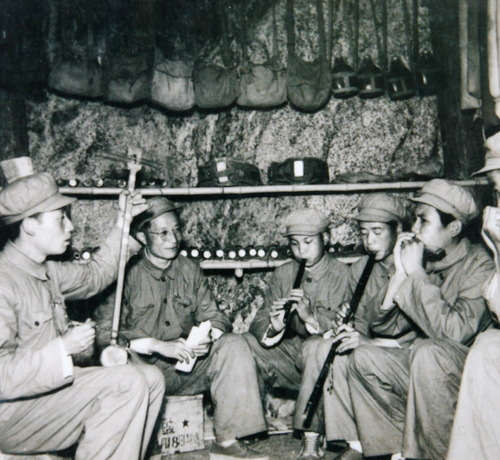 王莘在朝鮮戰場和慰問團排練《歌唱祖國》(左二為王莘)