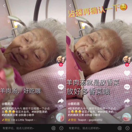 但凡喜歡刷抖音的人,一定刷到過百歲“吃貨奶奶”的視頻,老年“少女”開開心心喝可樂、奶茶、白酒,吃火鍋、燒烤、串串、漢堡、雞腿、雪糕……因為反差萌,吸引了不少鐵桿小粉絲,如今她的抖音粉絲近700萬,獲贊過億。