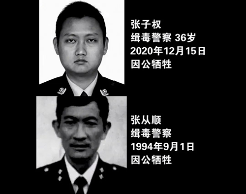 這兩張照片中的人,是一對父子,兩代緝毒警察。在父親犧牲26年后,張子權和父親張從順的照片一起出現在了公眾面前。