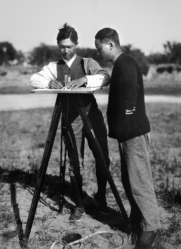 殷墟第一次發(fā)掘,董作賓(右)參與測量繪圖(資料照片)。新華社發(fā)(安陽市殷墟博物館提供)