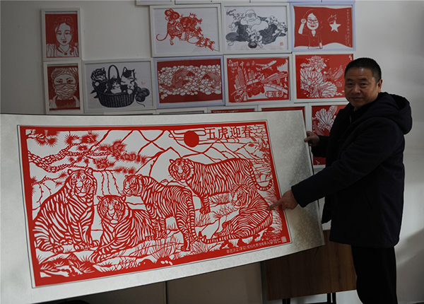 一把剪刀,一叠红纸,剪刀翻飞间,5只老虎神态各异、惟妙惟肖,虎虎生威。非遗传承人廖哲仁创作出《五虎迎春》剪纸作品,用指尖上的传统技艺迎接虎年到来。