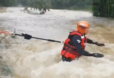 因河水暴涨,广东省韶关市新丰县马头镇横岭村有4名村民被困,消防救援人员在洪水中横渡,用绳索搭建起救援的“生命通道”,最后成功解救出全部被困村民。