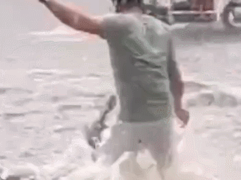 山东省莱州市突降暴雨,在一形成湍急水流的路段,一骑车女子被水冲倒,险些被冲走,一名小伙毫不犹豫飞奔过去将女子救起。