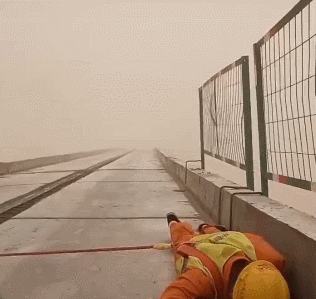 视频中,沙尘暴突然来袭,施工人员卧倒并通过安全绳固定自己,趴在桥面上屏住呼吸、双目紧闭,持续了一个多小时。