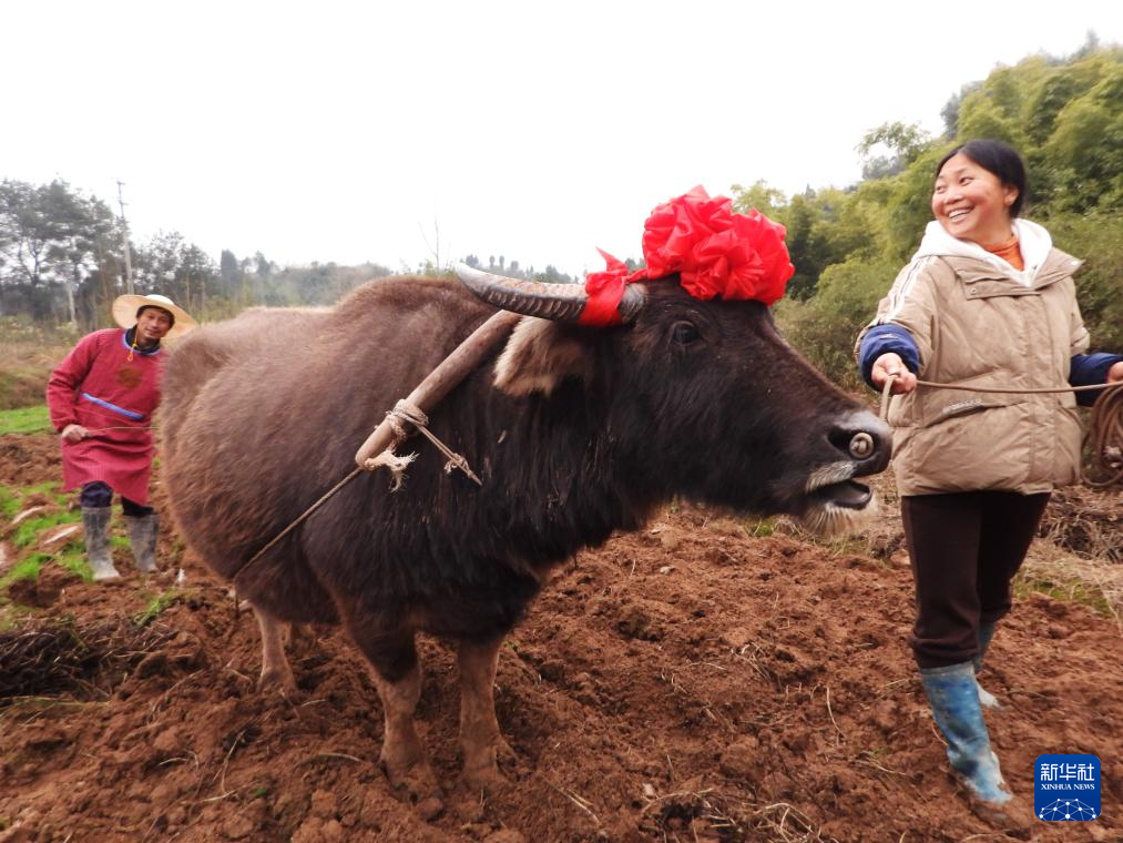 2月4日,四川省达州市大竹县竹阳街道农民在田间“犁春牛”,祈盼新的一年风调雨顺、五谷丰登。