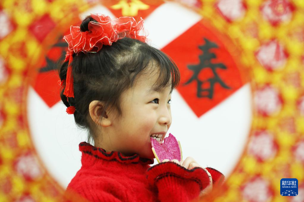 2月4日,在河北省唐山市丰润区太平路街道纺织二社区,小朋友在吃萝卜“咬春”。