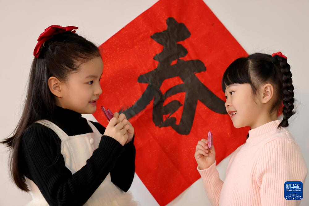 2月4日,在山东省枣庄市光明路街道东盛社区活动室,两名小朋友吃萝卜“咬春”。