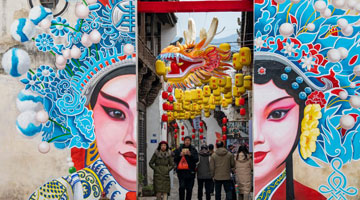 2月18日,人们在贵州省龙里县民俗踩街活动中表演太平花灯戏。