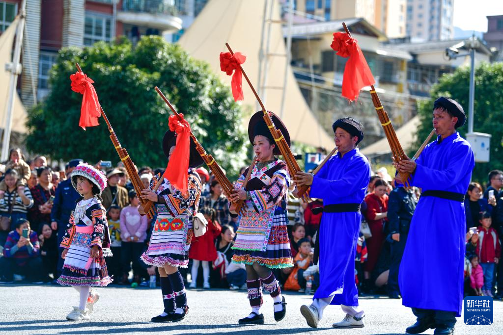 2月18日,人们在贵州省龙里县民俗踩街活动中跳芦笙舞。
